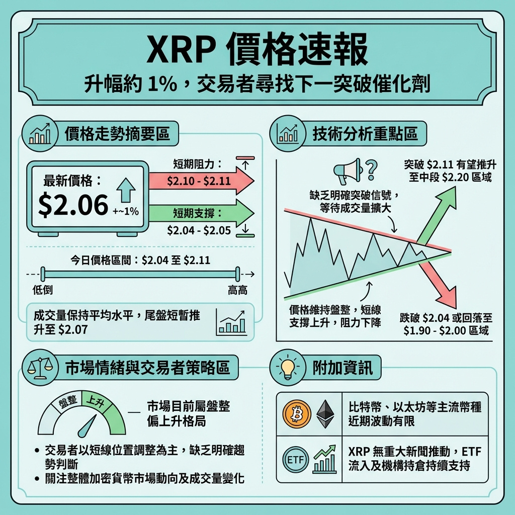 XRP價格微升至2.06美元,維持在2.04美元以上的支撐位,經歷一波波動後,市場仍在等待明確的推動因素。整體加密貨幣市場保持區間震盪,缺乏新消息帶動XRP出現顯著價格波動。交易員目前聚焦於短期價格水平,阻力位約在2.10美元,支撐位則在2.04美元左右。
