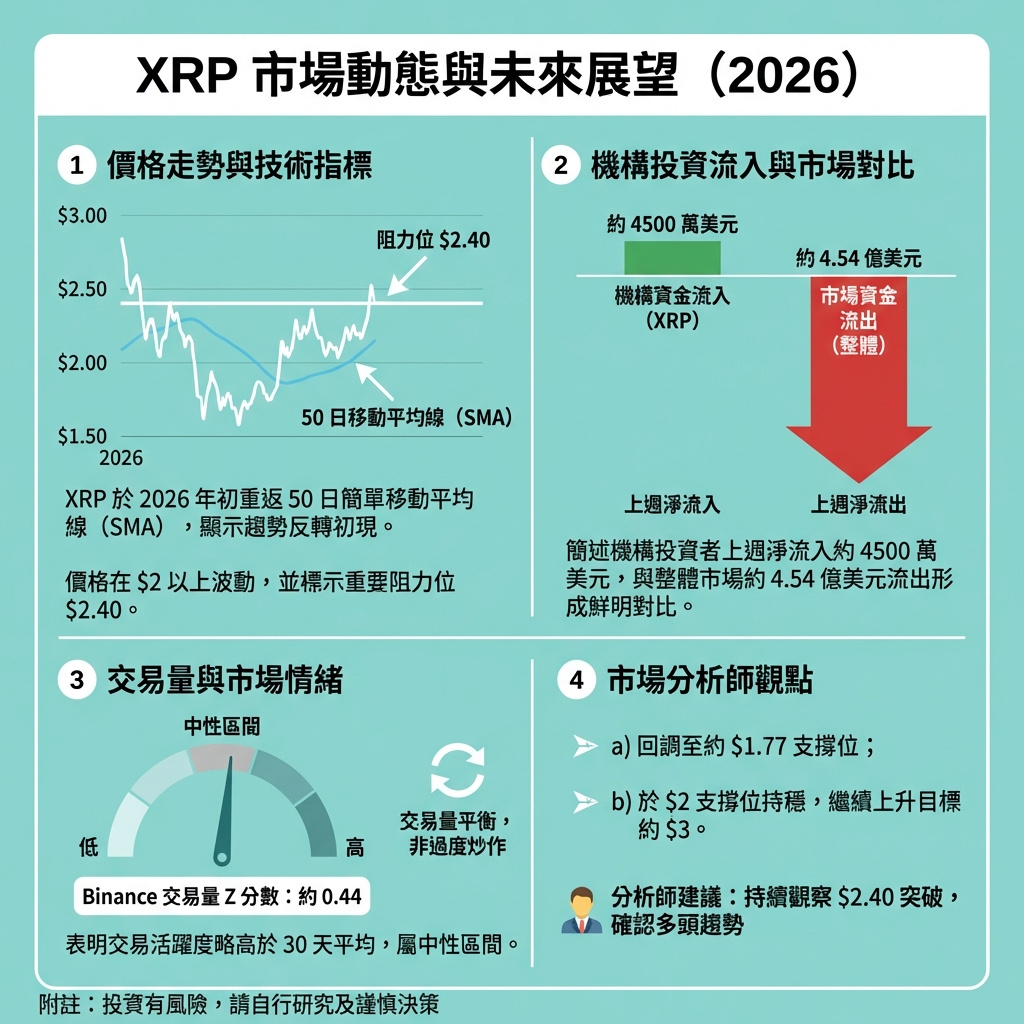 2026年伊始,XRP成功重回50天簡單移動平均線(SMA)之上,這是典型的下跌趨勢測試,若買家能保持主導,價格有望進一步上揚。不過,現階段的價格走勢更像是穩定而非快速上升。
