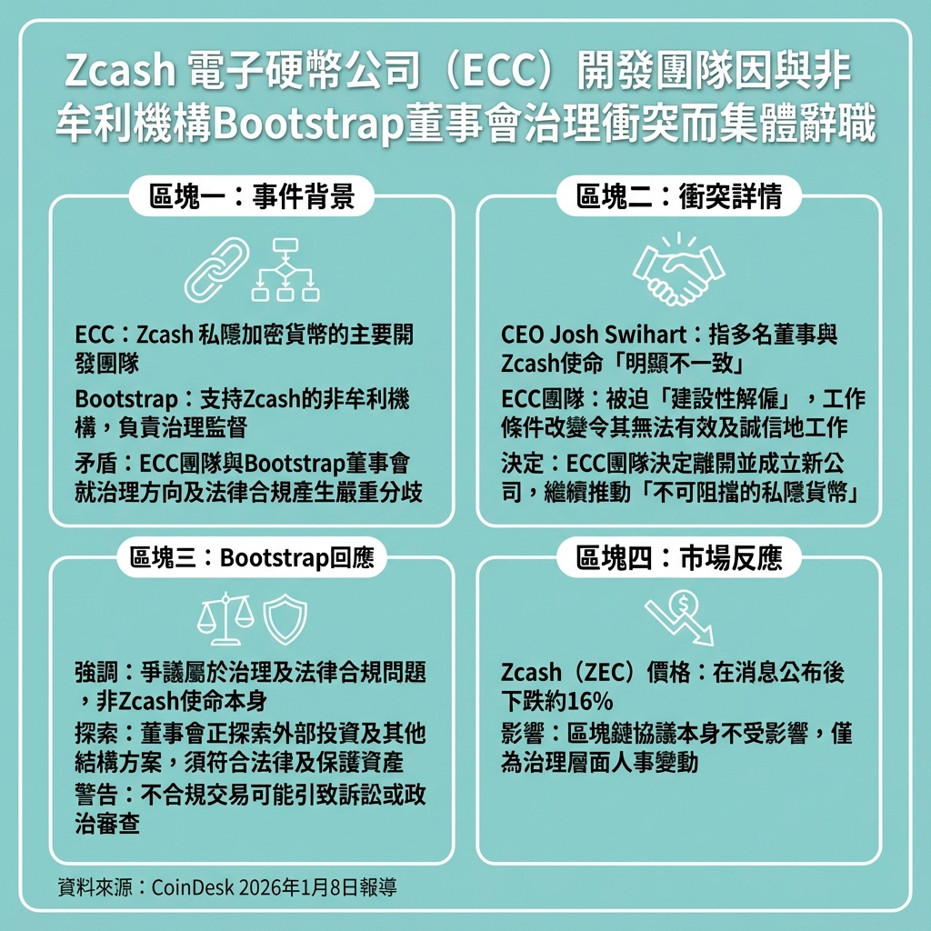 Electric Coin Company(ECC),作為隱私加密貨幣Zcash的主要開發團隊,近日宣布全體成員辭職,原因是與支持Zcash網絡的非牟利機構Bootstrap發生治理層面的嚴重分歧。ECC的行政總裁Josh Swihart指控,Bootstrap董事會成員,包括Zaki Manian、Christina Garman、Alan Fairless及Michelle Lai(合稱ZCAM),與Zcash的核心使命出現「明顯不一致」,導致團隊被迫離開。